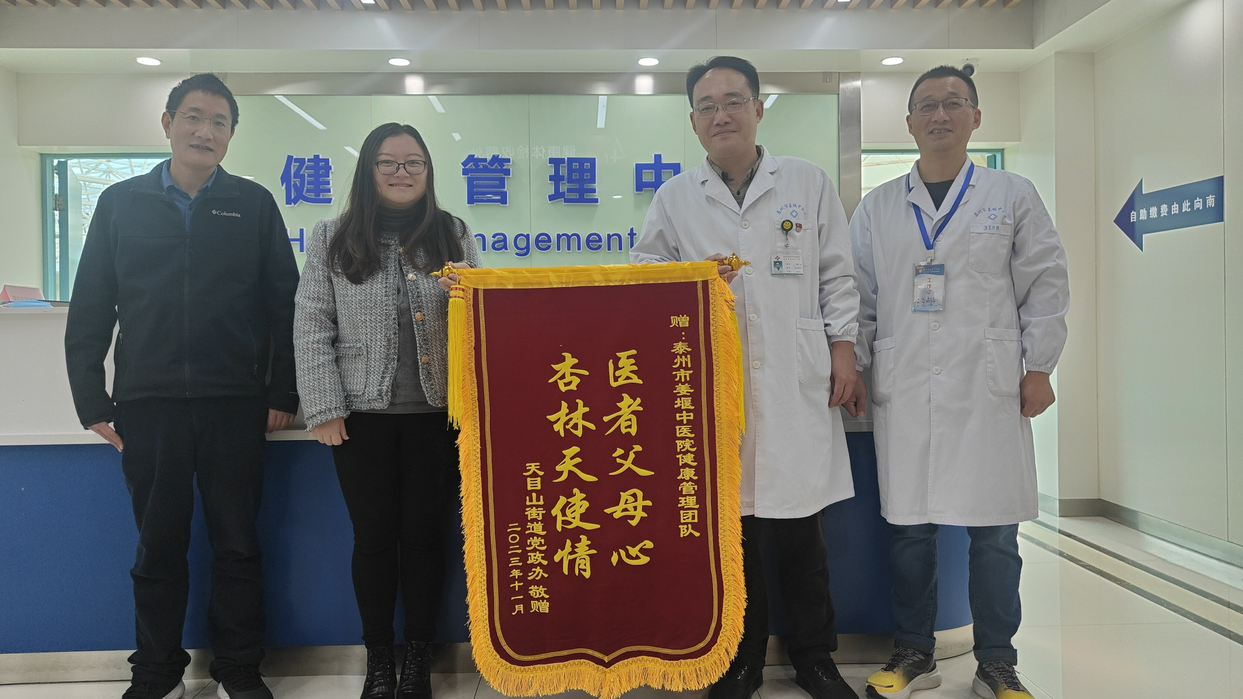 “医者父母心 杏林天使情”,这份满载深厚情谊的锦旗来自姜堰区天目山街道党政办。在我院健康管理中心,接过锦旗的陈成副院长表示:“通过体检工作为大家筛查各项健康隐患是我们的责任,姜堰中医院一定会坚持患者至上、服务至上的理念,全流程地服务好信任我们的体检客户!”