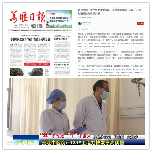 连日来,《学习强国》泰州学习平台、《姜堰日报》头版头条、融媒体《姜堰新闻》等媒体多角度、多频次报道泰州市姜堰中医院党建赋能“131”工程品牌建设。