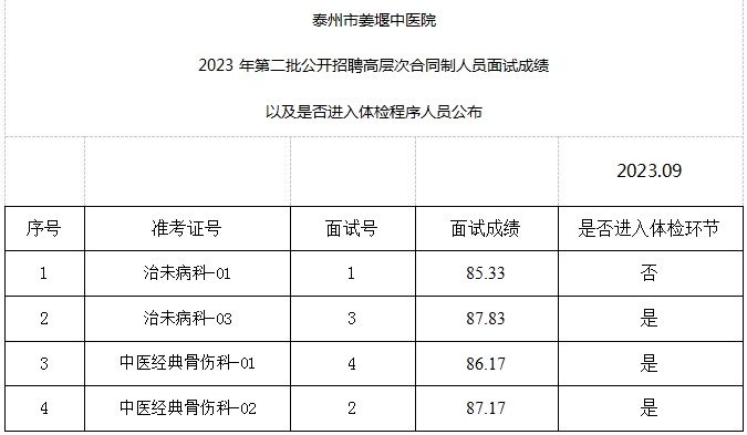 泰州市姜堰中医院2023年第二批公开招聘高层次合同制人员面试成绩以及是否进入体检程序人员公布
